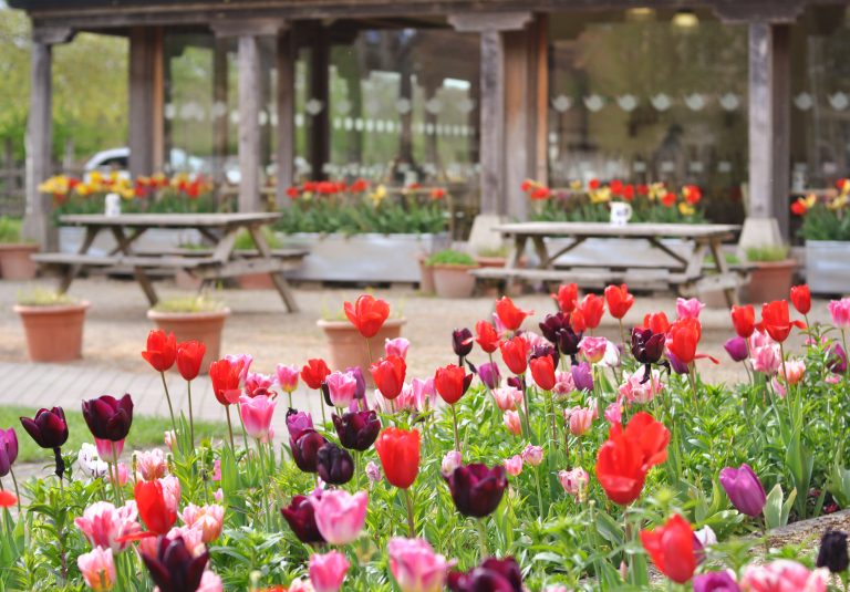 Tulips now flowering in the planters around the Café, in the borders around the shop and the grasses border.